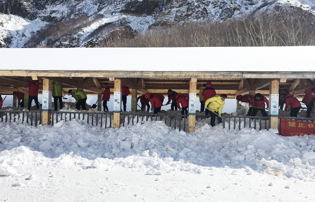 2017年3月5日,40余名志愿者在北景區(qū)老山門候車亭前集合,前往瀑布回廊清雪。長白山由于特殊的地理位置和氣候,冬季雪期長、雪量大,經(jīng)過一年積淀,回廊內(nèi)積雪平均厚度已達(dá)1.5米,面對艱巨的任務(wù),志愿者們用高漲的熱情對抗天寒地凍,經(jīng)過個6小時的奮戰(zhàn),下午三點(diǎn)回廊積雪被清掃一空,為迎接游人的到來做好了準(zhǔn)備。