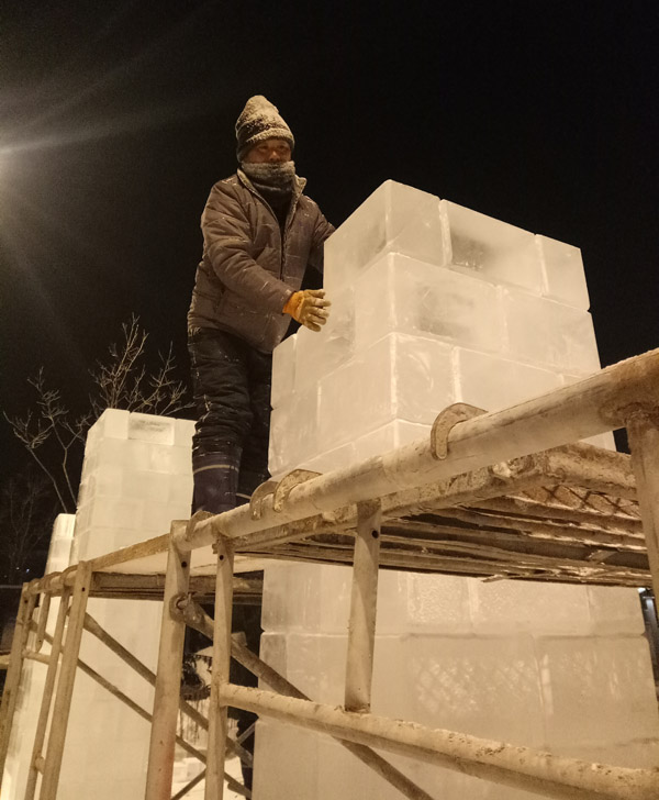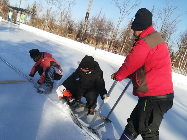 為保障工期質(zhì)量,運營一線抽調(diào)了由后勤、檢修等部門20余人組成的項目施工小組,連續(xù)20日,每日從早7:00到晚22:00全員加班加點,甚至通宵達旦,克服了人力不足、經(jīng)驗欠缺、沒有專業(yè)設(shè)備等重重困難,員工們?nèi)找岳^夜灑水造冰、造雪做雕,自主研制磨冰機、改裝切冰儀、造雪機水箱、雪墻磨具、象棋磨具等設(shè)備。因工程需到湖中取冰,在切割冰塊過程中,冰冷的水花濺滿了員工的鞋和衣服,零下20度的氣溫下,寒風掃過立刻被凍成“冰人”,個別員工腳和臉部被凍傷,但大家無一人抱怨、無一絲退縮,披星戴月,咬緊牙關(guān),高質(zhì)量如期完成了長白山大街“冰光大道”全程500米、1.5公里人行雪道、300余個雪人及彩燈亮化等工作任務(wù),達到了“少投入,多產(chǎn)出,控規(guī)模,重效果”的“粉雪節(jié)”活動初衷。施工期間,公司機關(guān)黨支部每日到工地為員工送熱姜湯和茶蛋等食物,慰問一線員工,緩解作業(yè)疲勞,讓員工們感受到了企業(yè)“一家親”的濃厚氛圍。