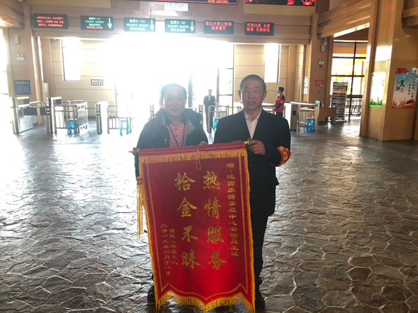 6月24日,池西游客服務(wù)中心副經(jīng)理王金鵬又接待了一位前來(lái)贈(zèng)送錦旗的游客。因?yàn)榘矙z員王波在6月13日,拾到一部三星手機(jī),并及時(shí)上交,通過多方了解才知道,失主是一位韓國(guó)游客,手機(jī)的及時(shí)歸還也為該游客省去了很多不必要的麻煩。所以,委托旅行社贈(zèng)送錦旗一面,稱贊王波拾金不昧的精神。同時(shí)這也是這個(gè)月里池西游客服務(wù)中心第二次有游客贈(zèng)送錦旗,這是對(duì)景區(qū)員工優(yōu)質(zhì)服務(wù)高度的認(rèn)可與贊揚(yáng)。