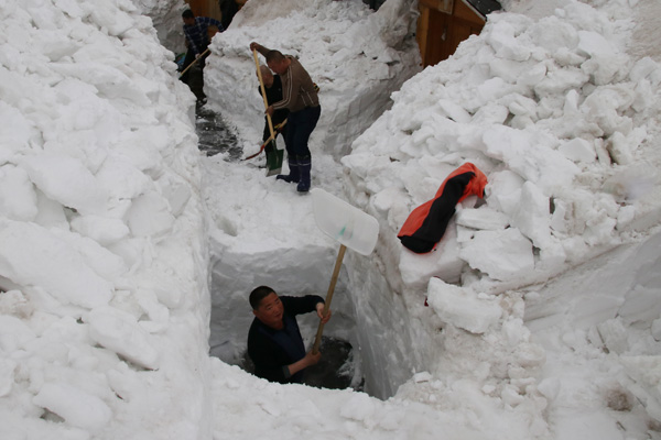 因長白山晝夜溫差大,厚厚的積雪上還覆蓋冰層,極大增加了積雪清理的難度,于是大家鎬頭、鐵鍬、鋸一起上,遇雪塊就鋸,遇冰就刨,絲毫沒有影響清雪的進(jìn)度。在這里,黨員干部和黨員們奮力揮鍬,這如同無聲的沖鋒號,鼓舞著每位清雪隊員。經(jīng)過3個小時的突擊,已經(jīng)清理近700米,兩側(cè)雪墻高3米。