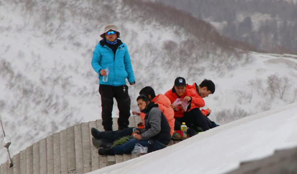 手套、棉衣、棉鞋早已被雪水和汗水浸濕,寒風(fēng)吹過格外的冷,累了就在雪墻上一靠、臺階上一坐,餓了把隨身攜帶的餐包拿出來,簡單吃一口。